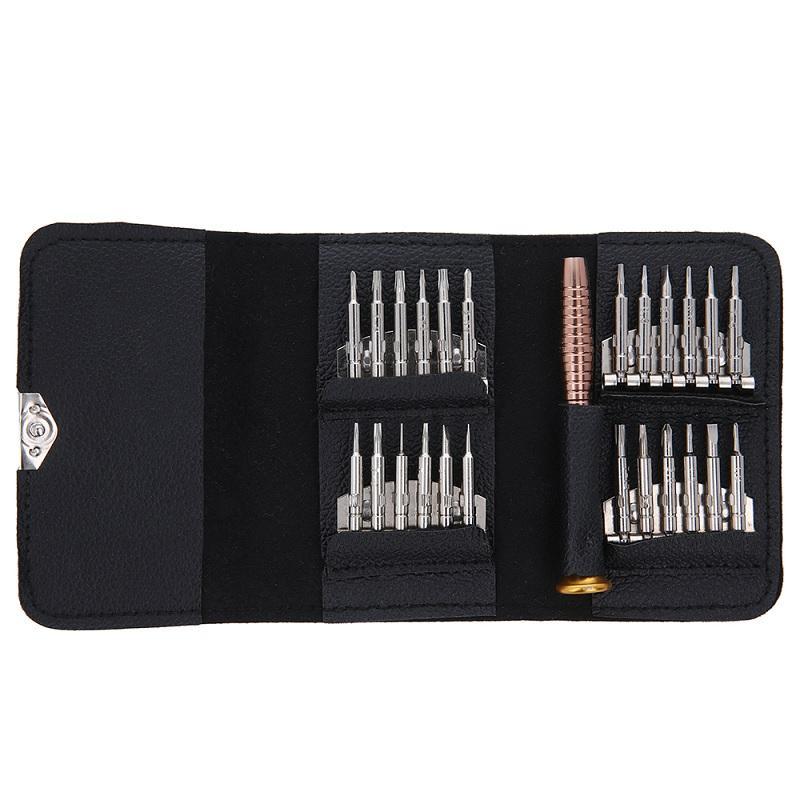 En högkvalitativ uppsättning med tjugofem verktyg för att öppna alla typer av elektroniska enheter. Hela setet är förpackat i ett plånboksformat fodral. Satsen innehåller en...