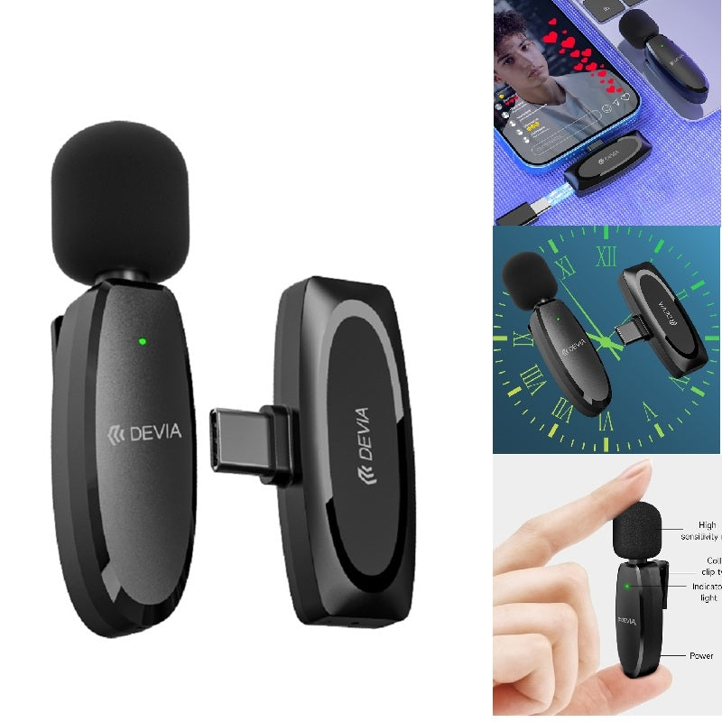 Få professionell ljudinspelning med Devia Kintone Trådlös Mikrofon, utformad för enheter med USB-C (Typ-C) anslutning – inklusive senaste iPhone 15/16-serien, Samsung Galaxy, Xiaomi, och andra Android- eller USB-C-kompatibla enheter.